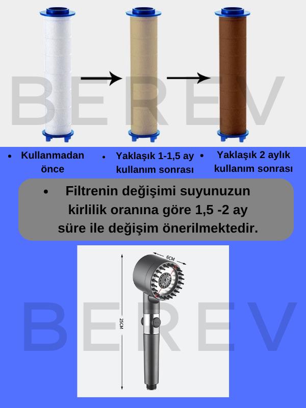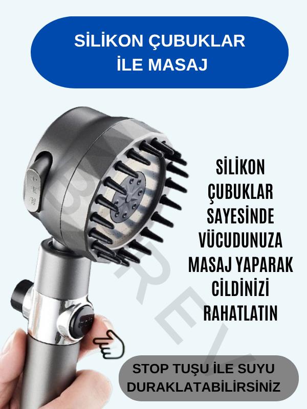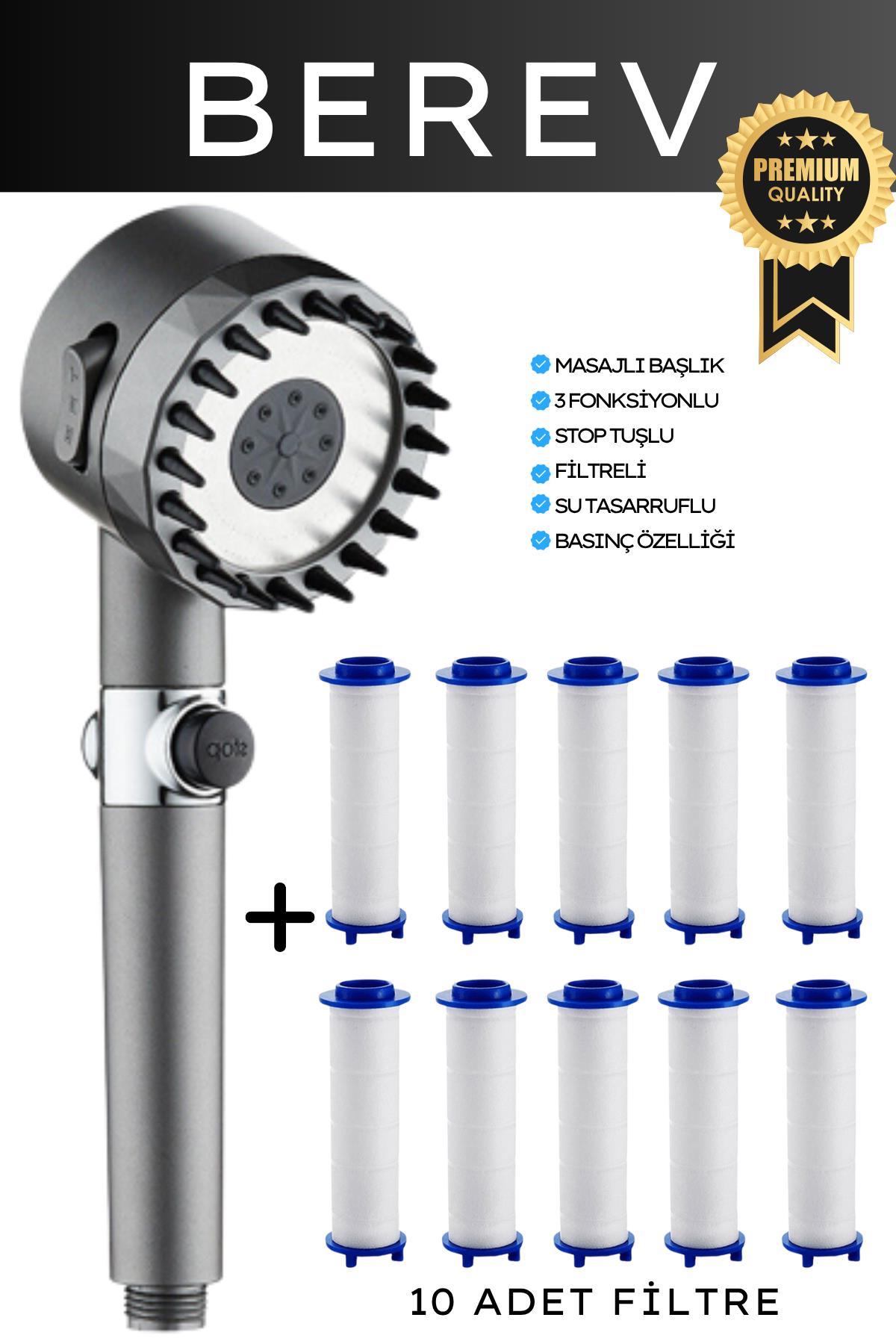 Yüksek Basınçlı Masaj Taraklı 3 Kademeli Aç Kapa Su Tasarruflu Filtre Hazneli Gri Banyo Duş Başlığı 10 Adet Yedek Filtreli